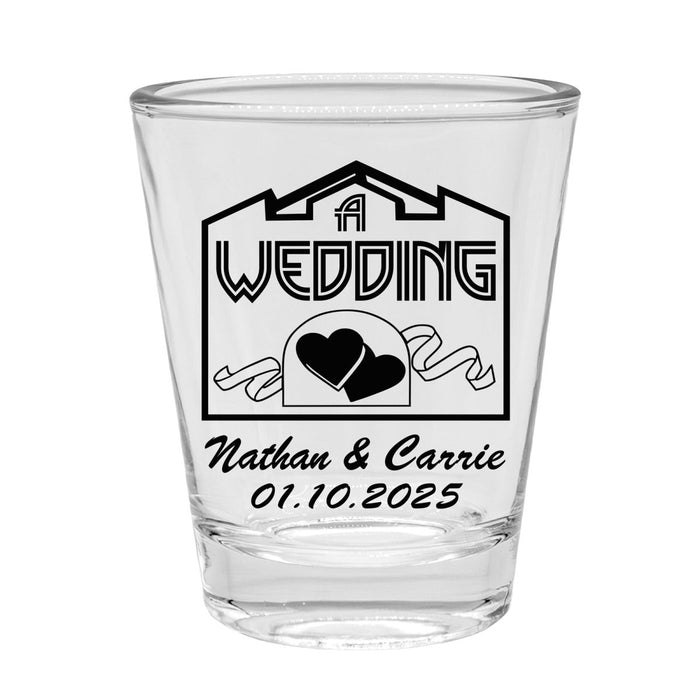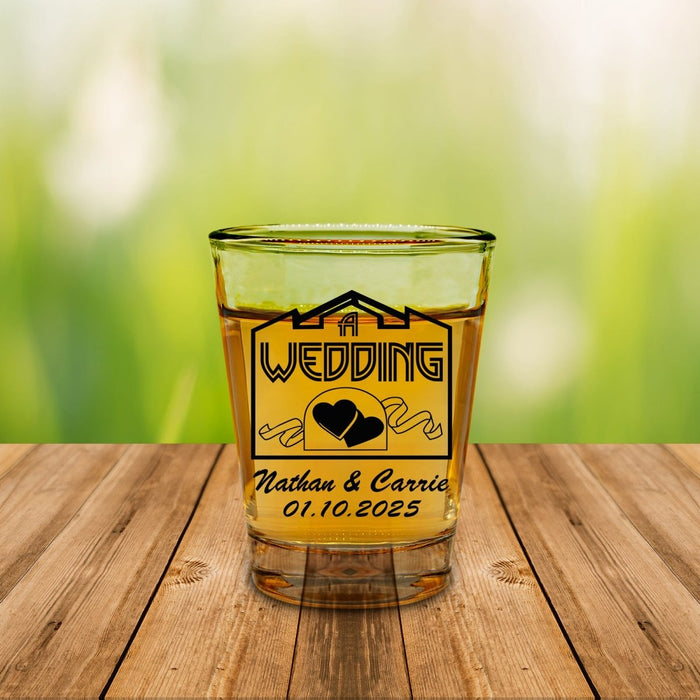 These 'Chapel' wedding themed shot glasses make for the perfect favors to commemorate your special day! Customize with your names and the memorable date. Our team of expert designers will take the information you provide and layout it out on this cute template design. You can even select from a variety of ink colors.
